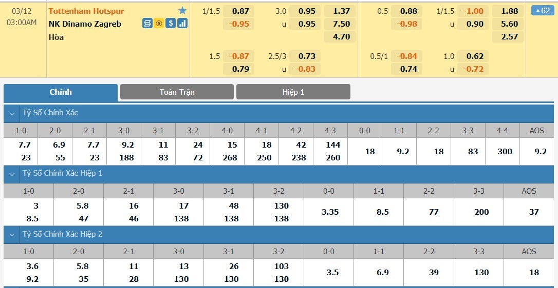 Tỷ lệ kèo cá cược bóng đá trận Tottenham vs Dinamo Zagreb