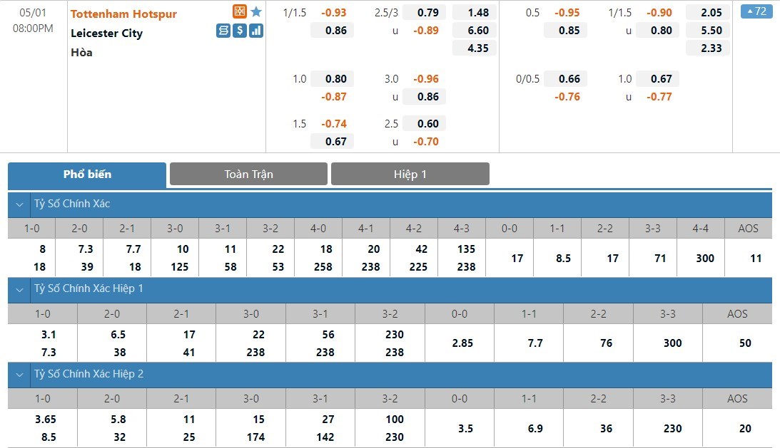 Xem tỷ lệ kèo cá cược bóng đá trực tuyến Tottenham vs Leicester
