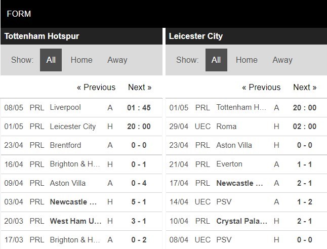 10 trận đấu gần đây nhất chứng kiến thành tích tương đối bất ổn của Tottenham khi mà đội bóng này mang về cho mình 6 trận thắng, 2 trận hòa và 2 trận thua. Đã 2 vòng đấu gần đây nhất, Tottenham đều không thể mang về cho mình một kết quả thực sự có lợi trước những đội bóng có lối chơi khó chịu là Brentford và Brighton. Chính điều đó đã khiến đoàn quân của HLV Antonio Conte đánh mất vị trí thứ 4 vào tay Arsenal. Chạm trán với đội bóng đang chơi thậm chí còn bất ổn hơn ở giai đoạn vừa qua là Leicester City, Tottenham sẽ cần phải cố gắng mang về cho mình 3 điểm trọn vẹn để tiếp tục bám đuổi Arsenal trên BXH.