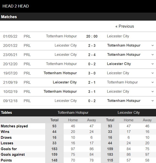 Ở 5 lần gần đây nhất hai đội chạm trán nhau, nếu như Tottenham mang về 3 chiến thắng thì Leicester cũng đã có được 2 lần hạ gục Gà Trống. Ngoài ra có tới 4/5 trận đấu kết thúc với tổng số bàn thắng từ 3 trở lên và điều đó cho thấy hai đội bóng này thi đấu tương đối cởi mở mỗi khi đụng độ nhau. Do đó, khả năng cuộc đối đầu tới đây nổ Tài là khá cao.