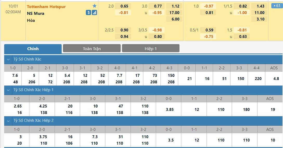 Tỷ lệ kèo cá cược bóng đá trận Tottenham vs Mura