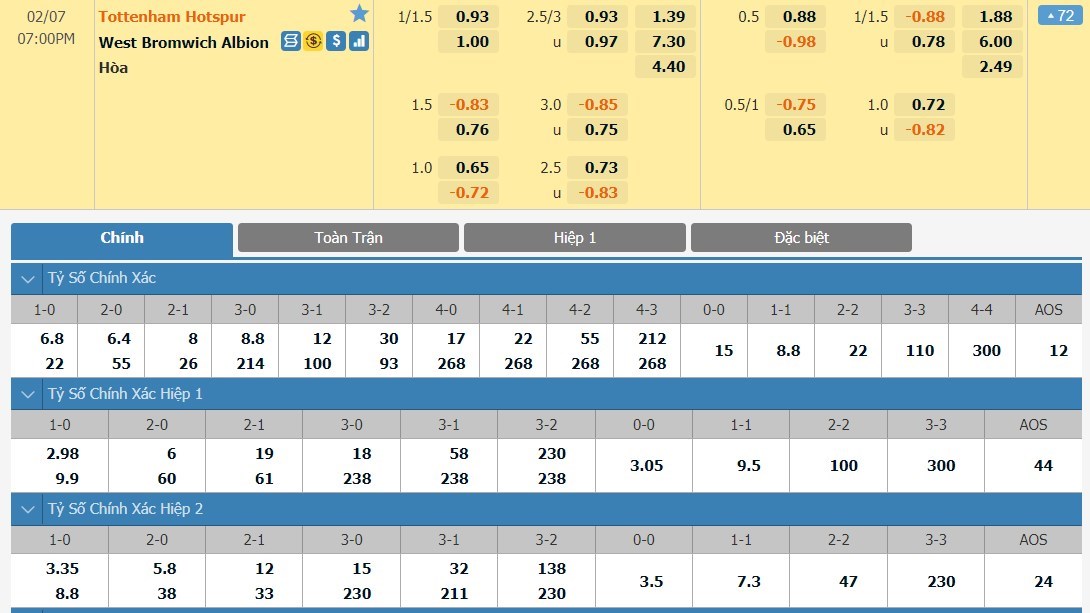 Xem tỷ lệ kèo cá cược bóng đá trực tuyến Tottenham vs West Bromwich