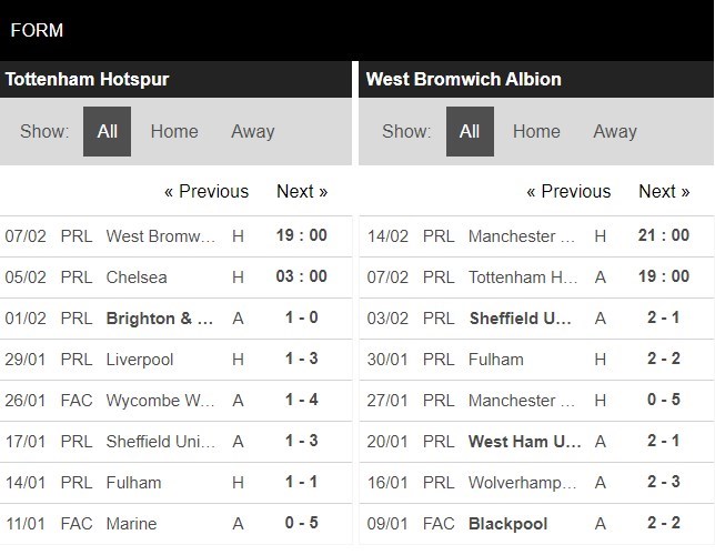 Thống kê phong độ Tottenham vs West Bromwich