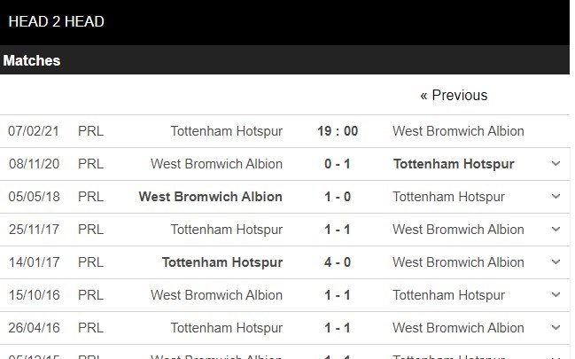 Thống kê đối đầu Tottenham vs West Bromwich