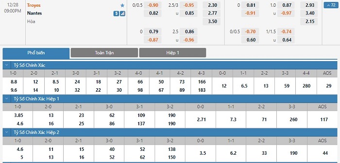 Tỷ lệ kèo cá cược bóng đá trận Troyes vs Nantes