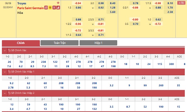 Chu kỳ lên xuống tỉ lệ kèo Troyes vs Paris Saint-Germain