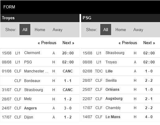 Thống kê phong độ Troyes vs Paris Saint-Germain