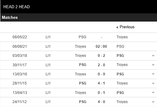 Thống kê đối đầu Troyes vs Paris Saint-Germain