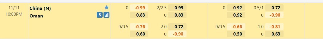 Tỷ lệ kèo cá cược bóng đá trực tuyến trận Trung Quốc vs Oman