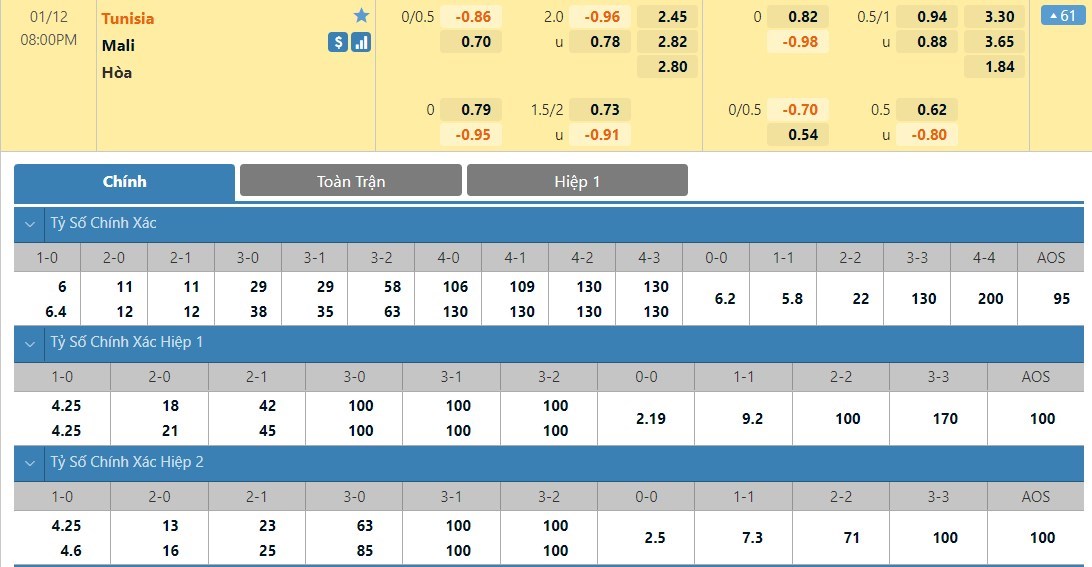 Tỷ lệ kèo cá cược bóng đá trận Tunisia vs Mali
