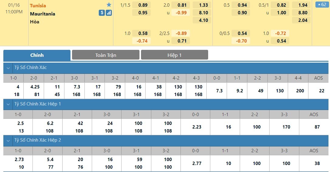 Tỷ lệ kèo cá cược bóng đá trận Tunisia vs Mauritania