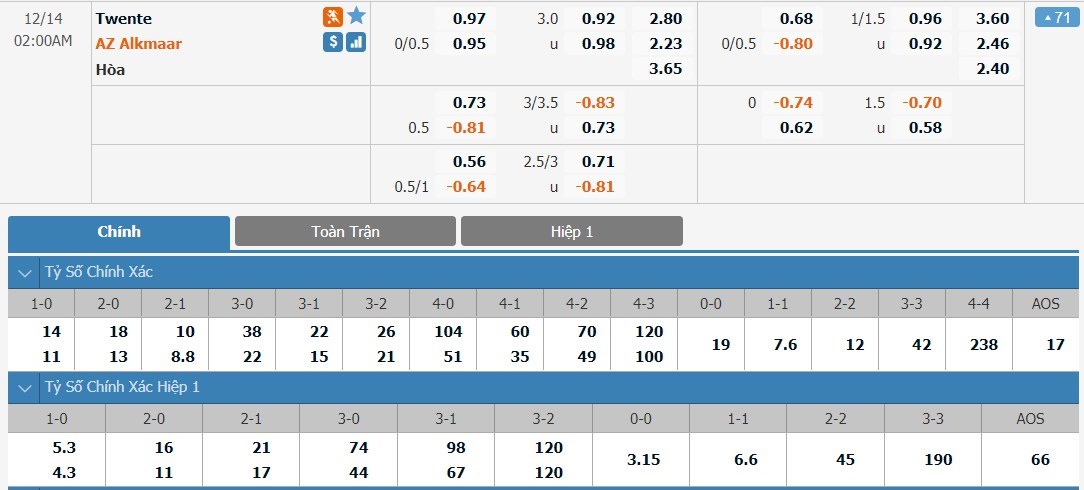 Tỷ lệ kèo cá cược bóng đá trận Twente vs AZ Alkmaar