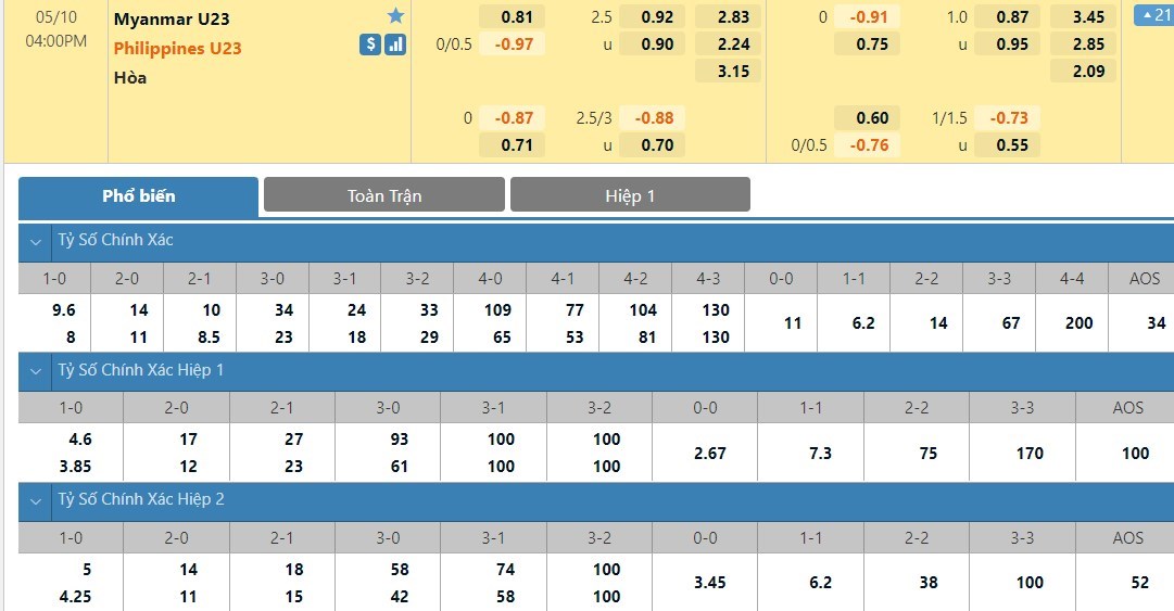 Tỷ lệ kèo cá cược bóng đá trực tuyến trận U23 Myanmar vs U23 Philippines