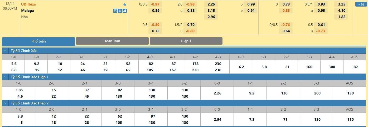 Tỷ lệ kèo cá cược bóng đá trực tuyến trận UD Ibiza vs Malaga