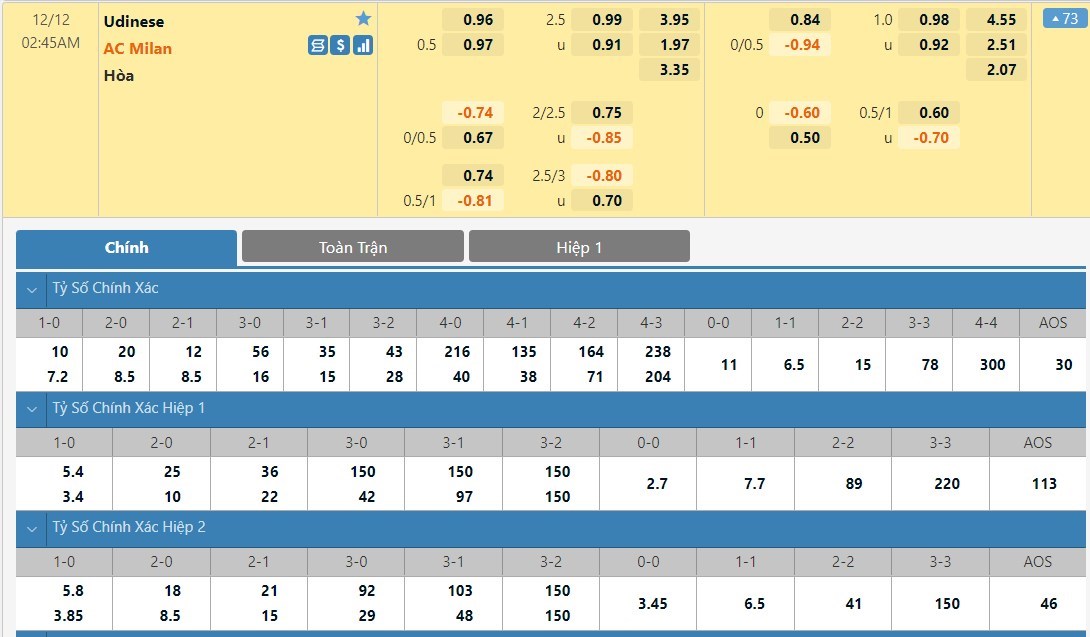 Tỷ lệ kèo cá cược bóng đá trận Udinese vs AC Milan