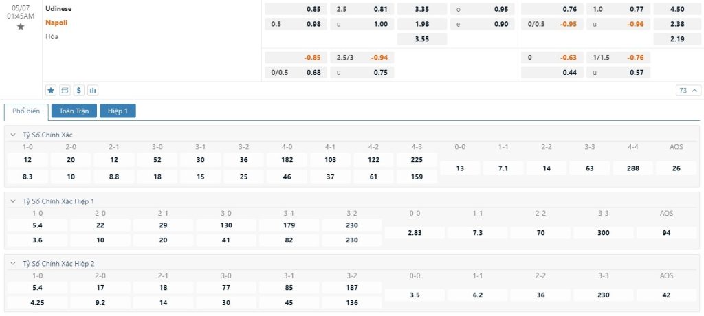 Chu kỳ lên xuống tỷ lệ kèo Udinese vs Napoli