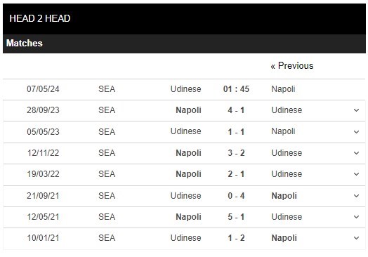 Thống kê đối đầu Udinese vs Napoli