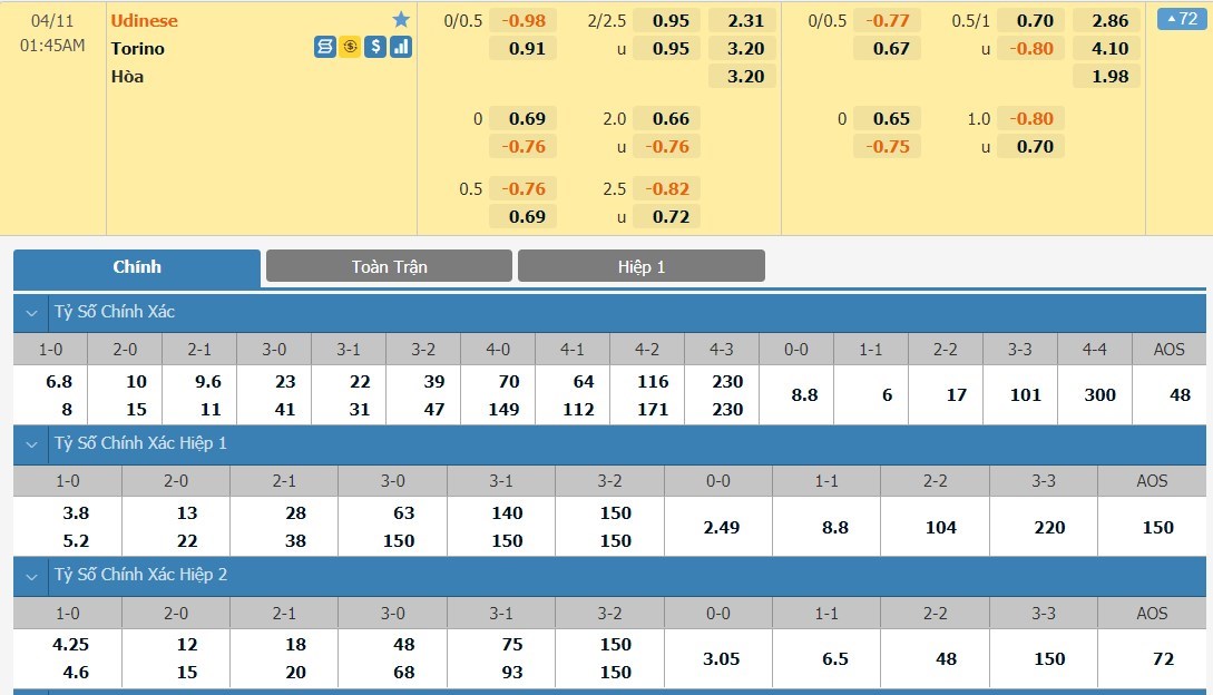 Tỷ lệ kèo cá cược bóng đá trận Udinese vs Torino