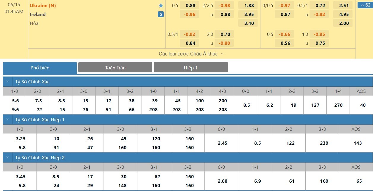 Tỷ lệ kèo cá cược bóng đá trận Ukraine vs Ireland
