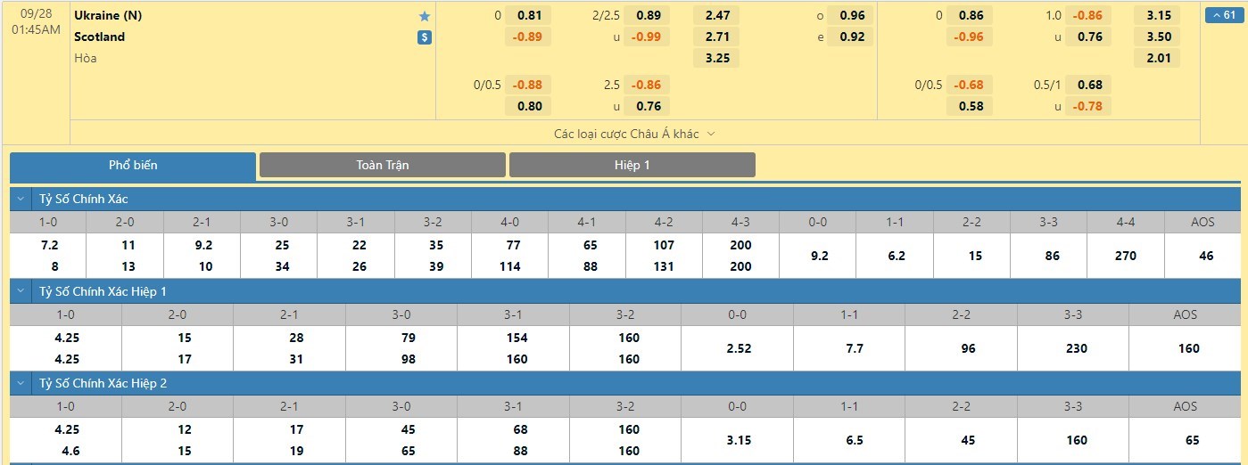 Tỷ lệ kèo cá cược bóng đá trực tuyến trận Ukraine vs Scotland