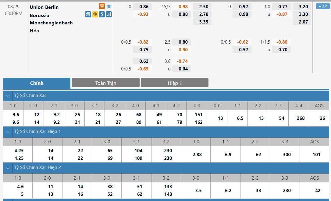 Tỷ lệ kèo cá cược bóng đá trận Union Berlin vs Borussia M.Gladbach