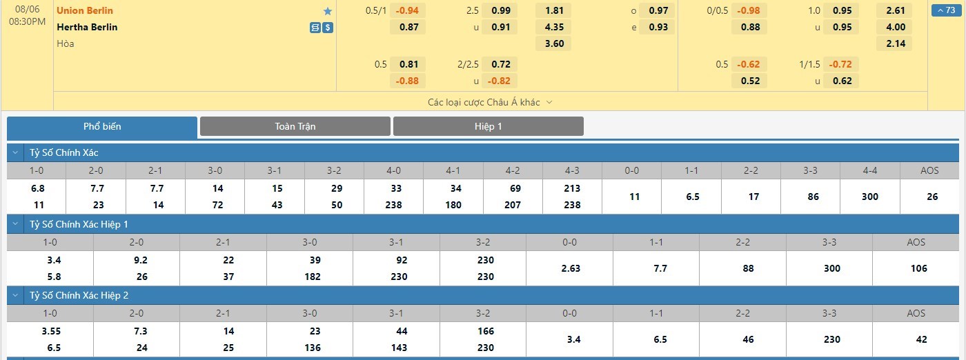 Tỷ lệ kèo cá cược bóng đá trận Union Berlin vs Hertha Berlin