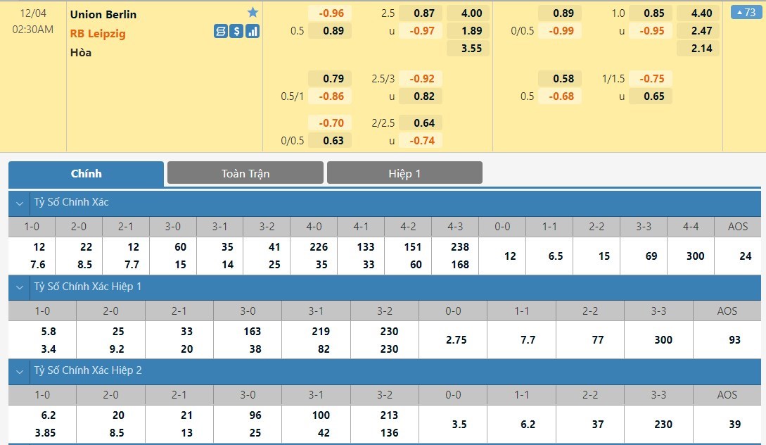 Tỷ lệ kèo cá cược bóng đá trực tuyến trận Union Berlin vs RB Leipzig