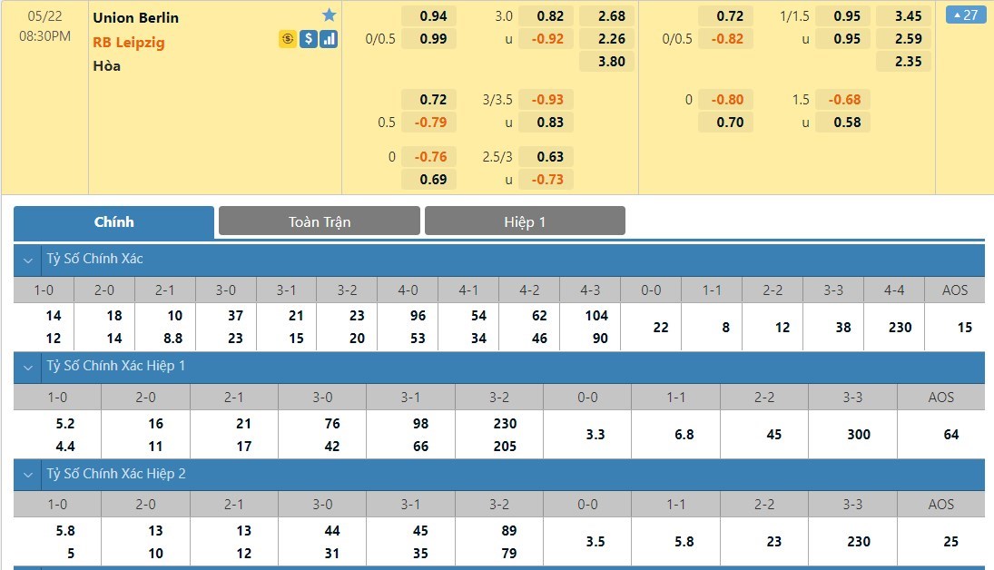 Tỷ lệ kèo cá cược bóng đá trực tuyến trận Union Berlin vs RB Leipzig