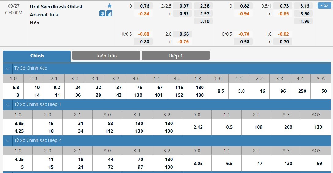 Tỷ lệ kèo cá cược bóng đá trực tuyến trận Ural vs Arsenal Tula