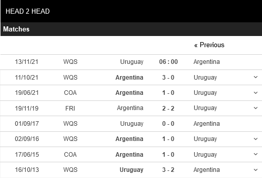 Thống kê đối đầu Uruguay vs Argentina