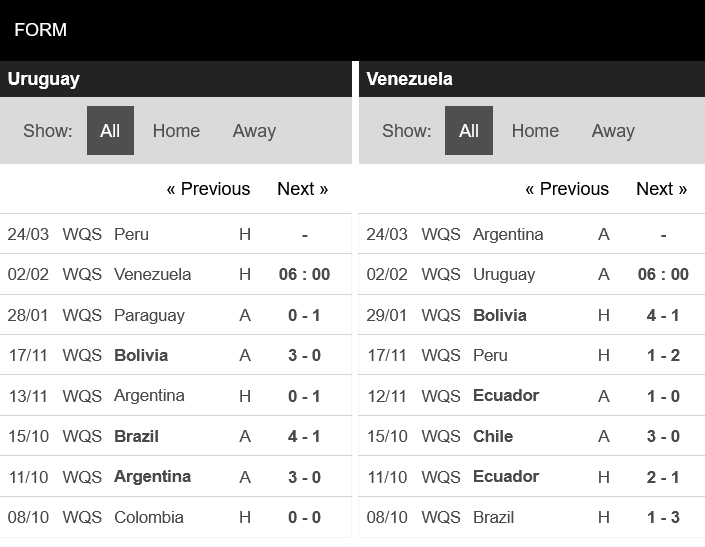 Uruguay sẽ khởi đầu với đối thủ yếu nhất trong số này là Venezuela. Tuy vậy, phong độ sân nhà của Uruguay gần đây khá phập phù. Họ chỉ thắng 2 trong 5 trận sân nhà gần đây. Tuy vậy, chiến thắng 1-0 trước Paraguay đang mang đến cho Uruguay sự tự tin cực kỳ lớn.