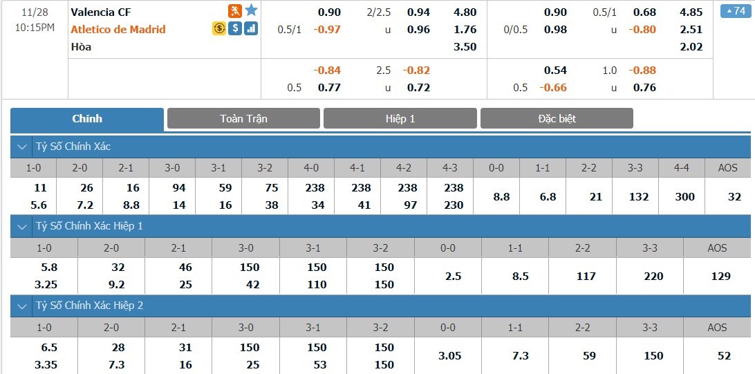 Tỷ lệ kèo cá cược bóng đá trực tuyến trận Valencia vs Atlético Madrid