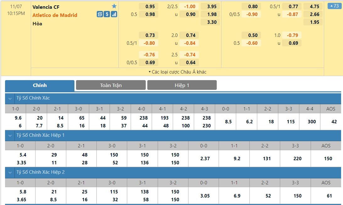 Tỷ lệ kèo cá cược bóng đá trận Valencia vs Atletico Madrid