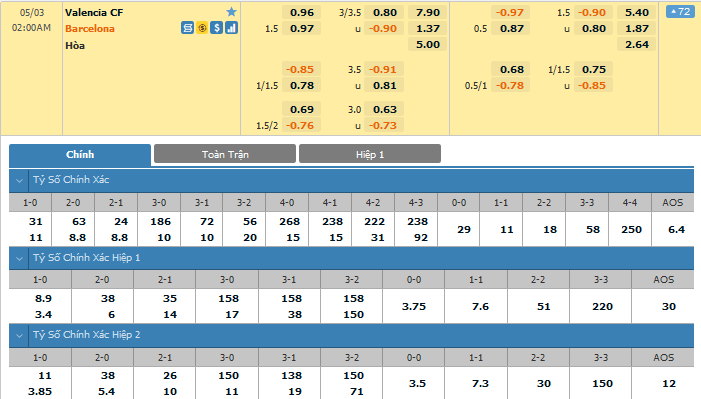 Xem tỉ lệ kèo cá cược bóng đá trực tuyến Valencia vs Barcelona