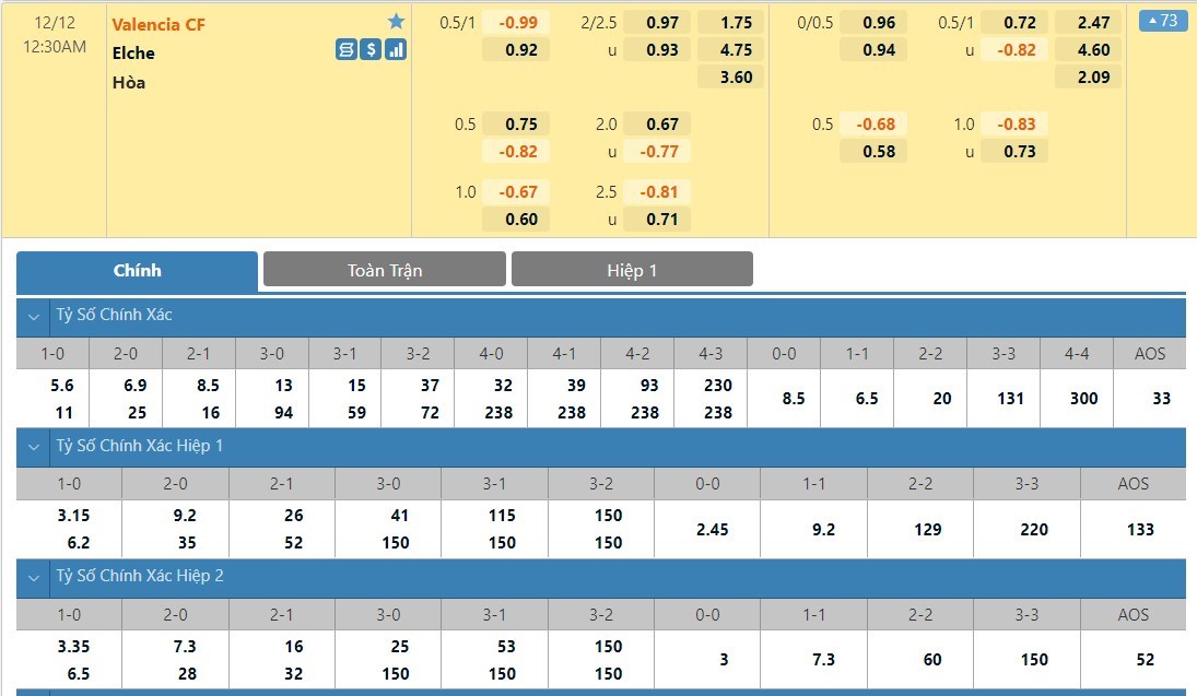 Tỷ lệ kèo cá cược bóng đá trận Valencia vs Elche
