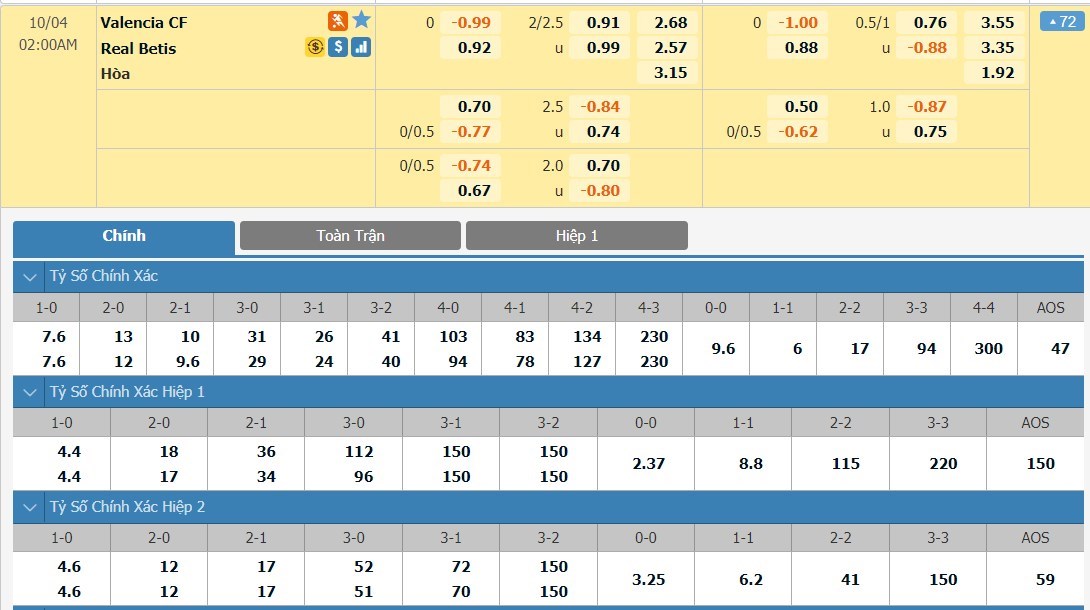 Xem tỷ lệ kèo cá cược bóng đá trực tuyến Valencia vs Real Betis