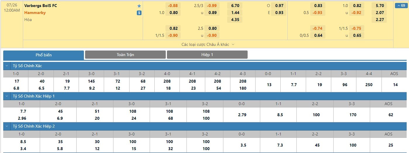 Tỷ lệ kèo cá cược bóng đá trận Varbergs BoIS vs Hammarby