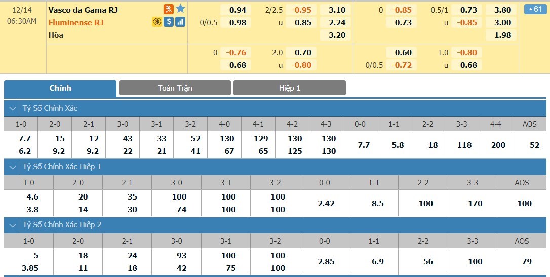 Tỷ lệ kèo cá cược bóng đá trực tuyến trận Vasco da Gama vs Fluminense