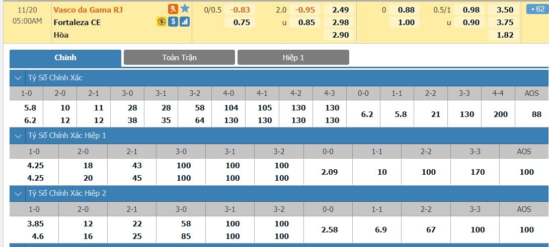 Tỷ lệ kèo cá cược bóng đá trực tuyến trận Vasco da Gama vs Fortaleza