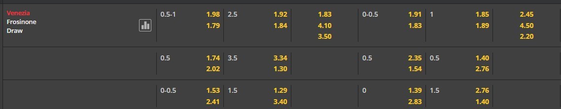 Tỷ lệ kèo cá cược bóng đá trực tuyến trận Venezia vs Frosinone