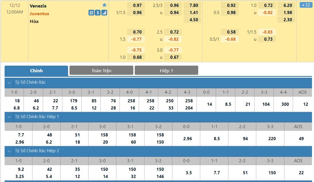 Tỷ lệ kèo cá cược bóng đá trực tuyến trận Venezia vs Juventus