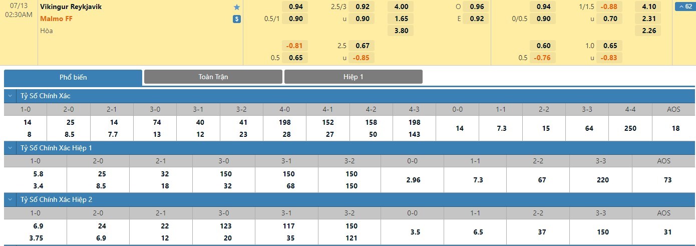Nếu như Vikingur Reykjavik sở hữu cho mình ít nhất 1 bàn thắng trong hiệp 1 ở 4/5 trận đấu gần nhất thì Malmo đã có 5 lần làm được điều này. Với tỷ lệ kèo hiệp 1 là -1/4 trái thì người chơi nên tin tưởng vào đội khách ở cuộc đối đầu này. Họ là đội bóng sở hữu chất lượng đội hình đồng đều hơn. Trong trận lượt đi, Malmo FF cũng là đội chiếm lợi thế dẫn bàn ở hiệp đấu đầu tiên.