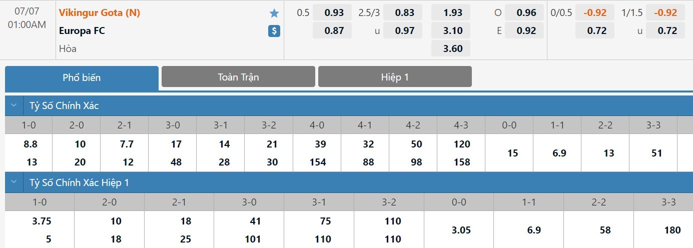 Tỷ lệ kèo cá cược bóng đá trận Vikingur vs Europa FC