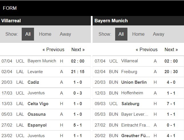 Thống kê phong độ Villarreal vs Bayern Munich