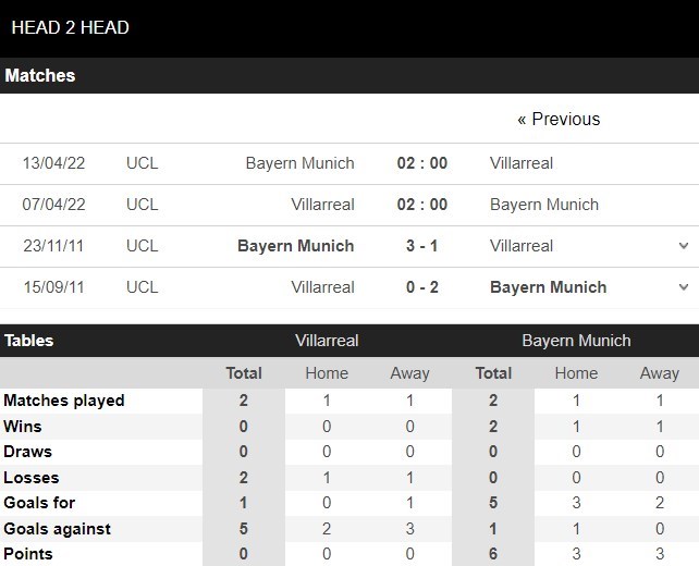 Thống kê đối đầu Villarreal vs Bayern Munich