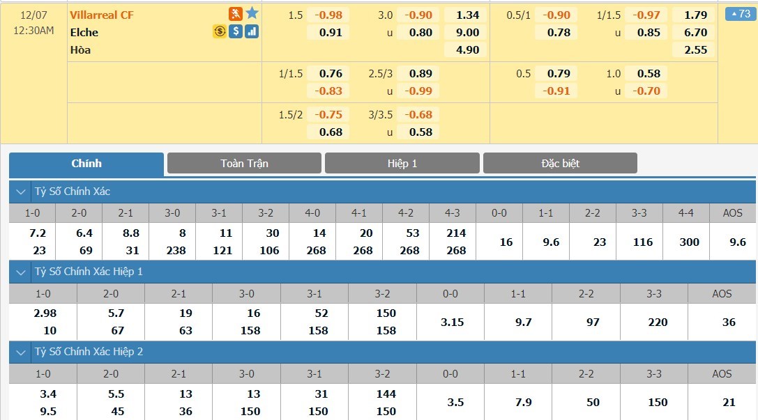Tỷ lệ kèo cá cược bóng đá trực tuyến trận Villarreal vs Elche