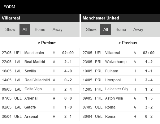 Thống kê phong độ Villarreal vs Manchester United