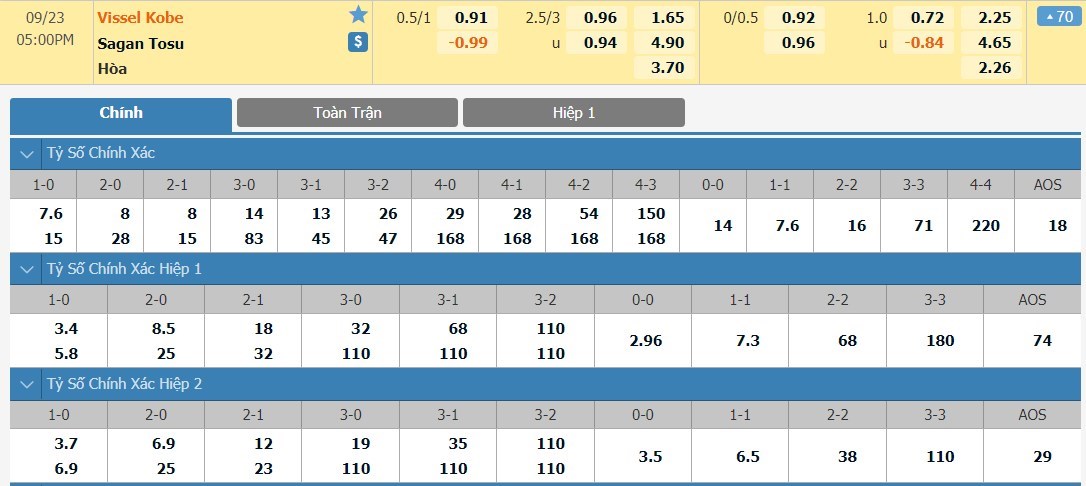 Tỷ lệ kèo cá cược bóng đá trận Vissel Kobe vs Sagan Tosu