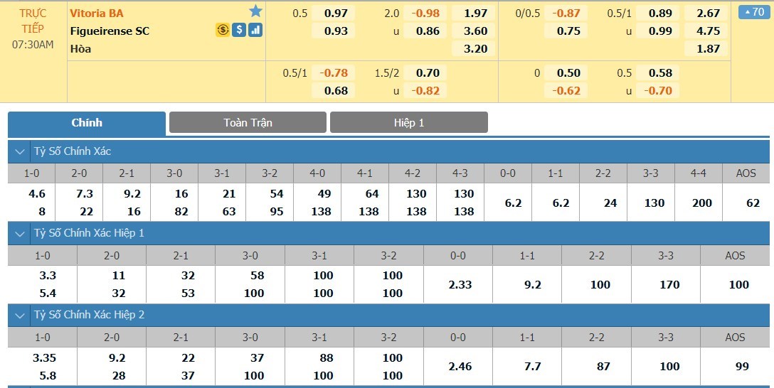 Tỷ lệ kèo cá cược bóng đá trận Vitória vs Figueirense