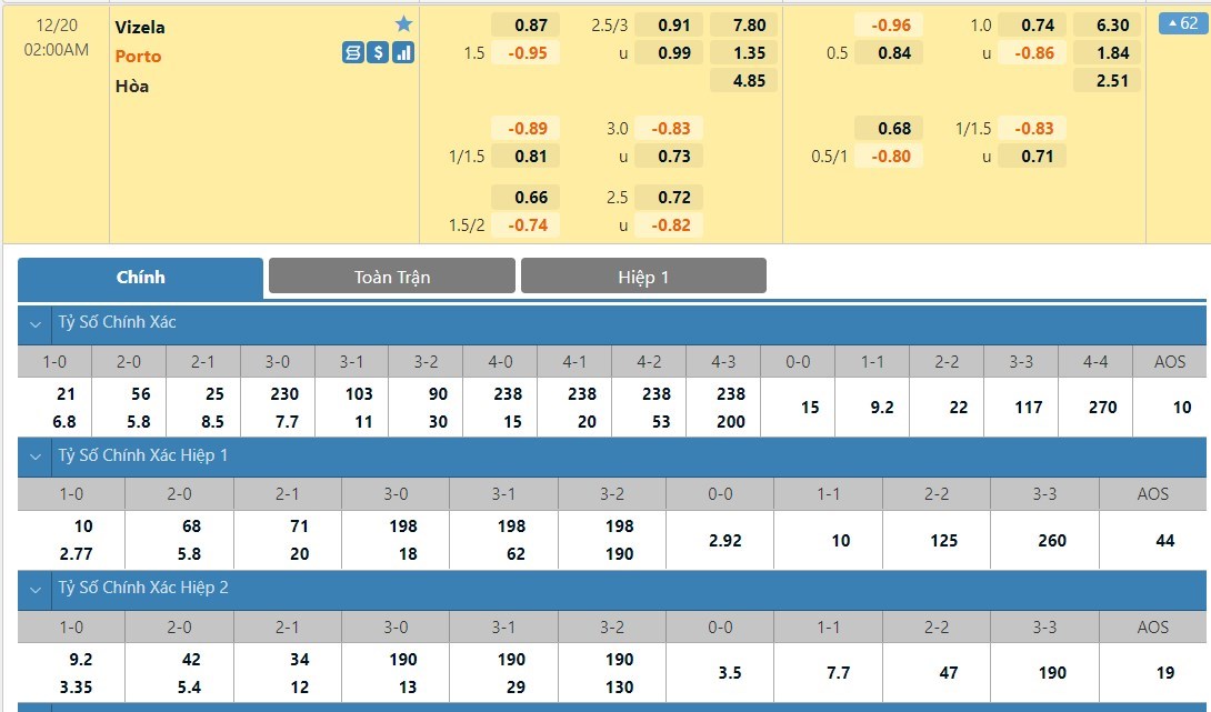 Tỷ lệ kèo cá cược bóng đá trực tuyến trận Vizela vs Porto
